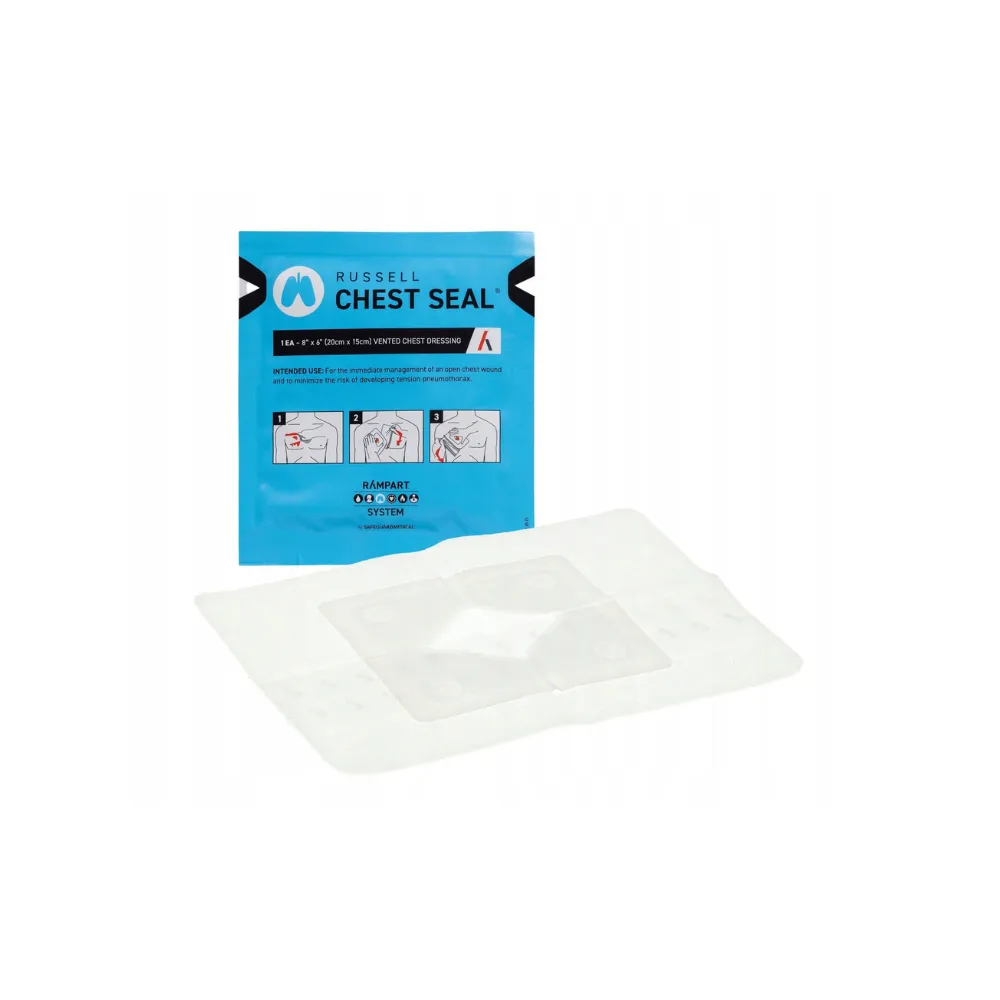 Opatrunek wentylowy Russell Chest Seal® przeznaczony jest do zaopatrzenia ran penetrujących w obrębie klatki piersiowej. Jest jednym z większych pod względem pokrycia opatrunkiem wentylowym. Jego konstrukcja ułatwia ewakuację powietrza i krwi z rany, jednocześnie likwidując ryzyko zassania powietrza z otoczenia do jamy opłucnowej. Składnik hydrożelowy zapewnia pełną szczelność i bezpieczeństwo. Doskonale przylega do spoconej i owłosionej skóry. Opatrunek został przetestowany i sprawdzony w działaniach na polu walki.